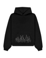 Black hoodie with flame design on the back pocket against a white background